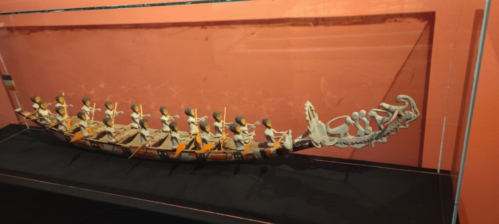 Ces objets camerounais « pris de manière illégale » pendant la colonisation allemande abondent. Ce sont notamment des masques, des fusils, des fauteuils royaux, des pirogues à l’intérieur desquelles se trouvent des pagayeurs… Parmi ces objets, la canne de Rudolph Douala Manga Bell, celle qu’il a utilisée lors de son séjour en Allemagne entre 1891 et 1896. Il y a aussi des photos qui retracent le mode de vie à l’époque coloniale, notamment le quotidien des populations, les maisons, les hôpitaux. Il y a également des cartes, celles montrant le découpage administratif du Cameroun, l’évolution de la carte du Cameroun jusqu’à sa forme actuelle.